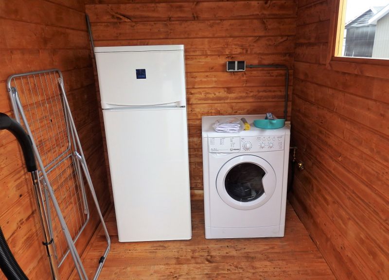 Tuinhuisje: In het tuinhuisje staat de wasmachine/droger, een extra koel/vriescombinatie, de kussens van de lounge- en het tuinset en een parasol. Er is hier tevens opslagruimte voor de fietsen.