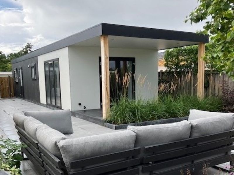 Tuinhuisje: Het tuinhuisje is voorzien van dezelfde buitenbekleding als de woning. In het tuinhuisje kan de wasmachine, droger en eventuele extra koelkast of vriezer worden geplaatst, de aansluitingen zijn al aanwezig.